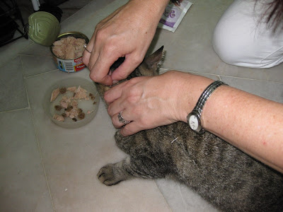 As the needles went in, Tiger was given the whole can of water-based tuna. He was so happy he did not protest in the slightest!