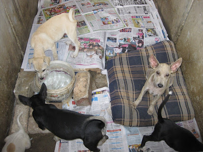 The last two males woke up from the anaestesia a bit too early (they were given the Reversine) and spent some time yelping and crying in pain. It was heart-wrenching for all of us, but the vets assured us everything was under control. We were also advised not to mother them too much as they would yelp even more (like small children?). So we had to finally leave them in a cage and cover the cage with towels. True enough, they settled down after some time.