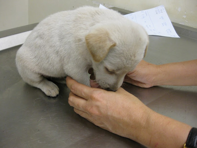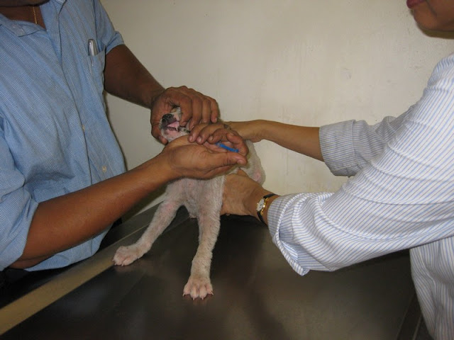 Miss Husky, up for a physical examination first. All the puppies were weighed, so that Dr Vijay could administer the correct deworming dosage.