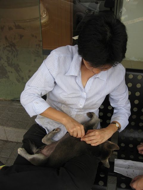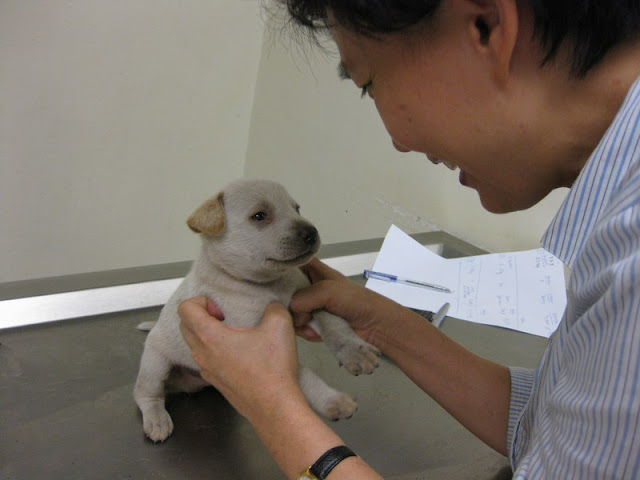 Ivermectin for the mange, and that would cover deworming already. No fever. He’s Number Five. By the way, Dr Vijay and Dr Loh took turns to carve their masterpieces on the puppies for identification. We were impressed.