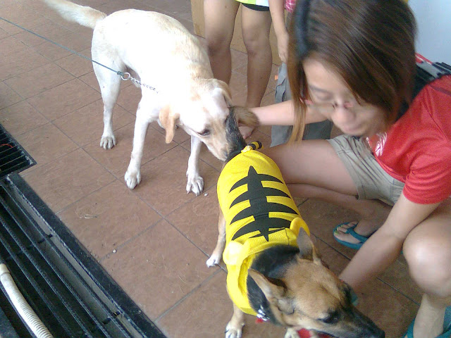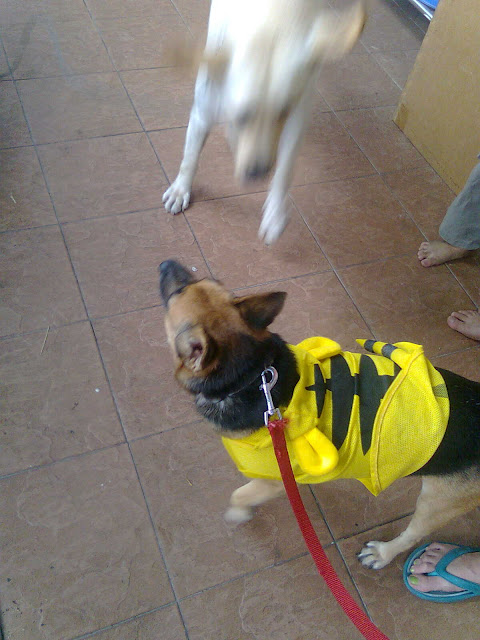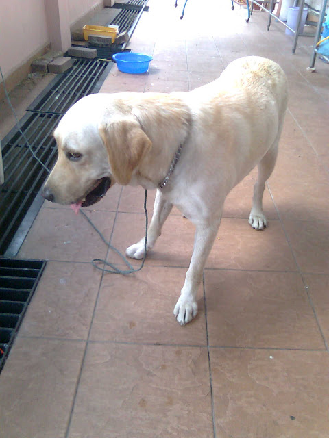 We took Tara to meet “Boy”. Boy is the labrador rescued at the temple about a week ago when he was being attacked by eight stray dogs nearby.