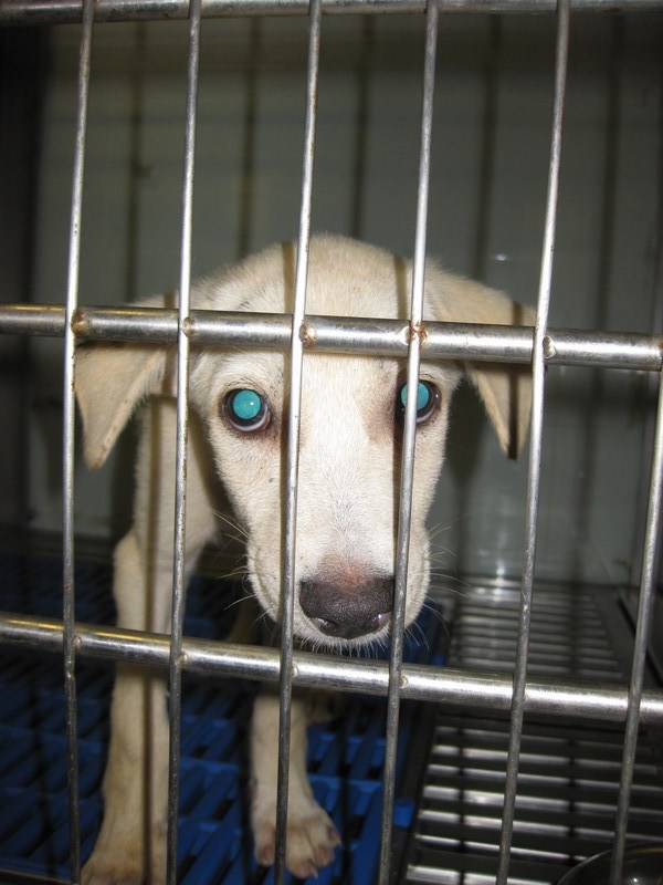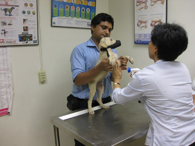 PAWS offered shelter for them, and we took the sickly-looking ones to our panel vet for a check-up and treatment that evening itself (never delay treatment for animals). Our vets extended their working hours for all the puppies that evening – we finished at almost 10pm. This photo shows Snappy White. He had to be muzzled because he snapped at everyone!