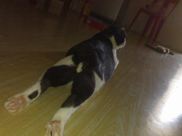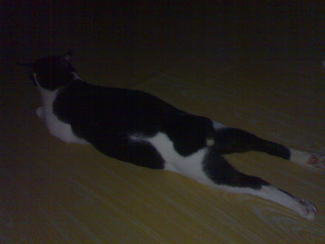 Cow cannot patent his Fish Pose anymore. So far, we’ve had a rabbit called Snowy doing it. Ms Fida’s cat as well.