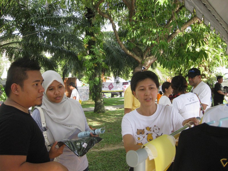 Today, Mun Yee (the one in the centre) would help me out in the morning as I had to deliver a talk at the Bandar Utama Buddhist Society (BUBS). But I was there are 8am with the day’s “goods” and to set up the booth. Mun Yee also enlisted the help of Wendy, his cousin-in-law. We had a surprise “drop-in” by Chee Onn, our Gold tshirt designer and the one who finalised the Yellow Speak Up tshirt for me. Chee Onn and his friend, Daniel, help us a lot with the artwork that we need for our buntings, tshirts and brochures.