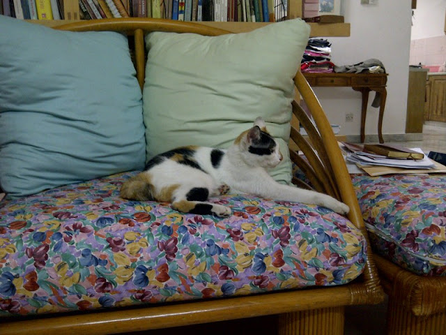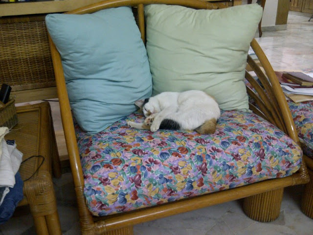 (It’s Cleo, our Calico princess. And this is her armchair.)