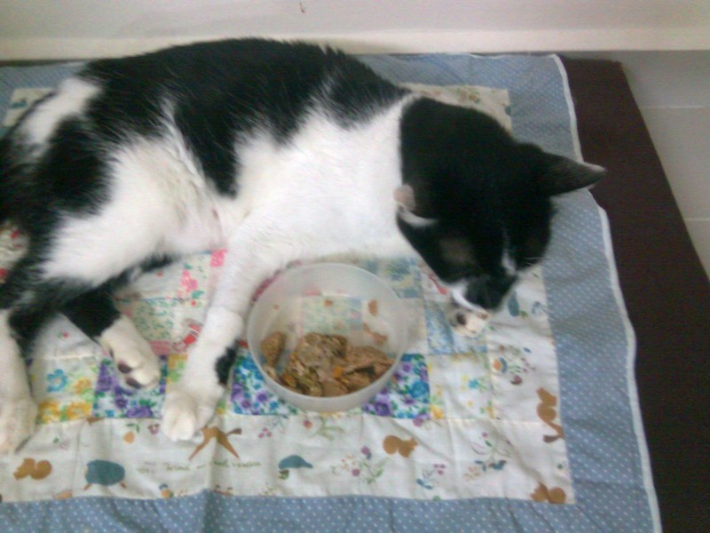 This evening, I cooked a home meal and all the cats ate it. I’ve been so busy in the last few days, I hadn’t had time to cook them a meal. Initially, Indy did not want any of it at all, so later, I mixed wetfood with the home-cooked meal. He ate up all the home-cooked and left the wetfood!