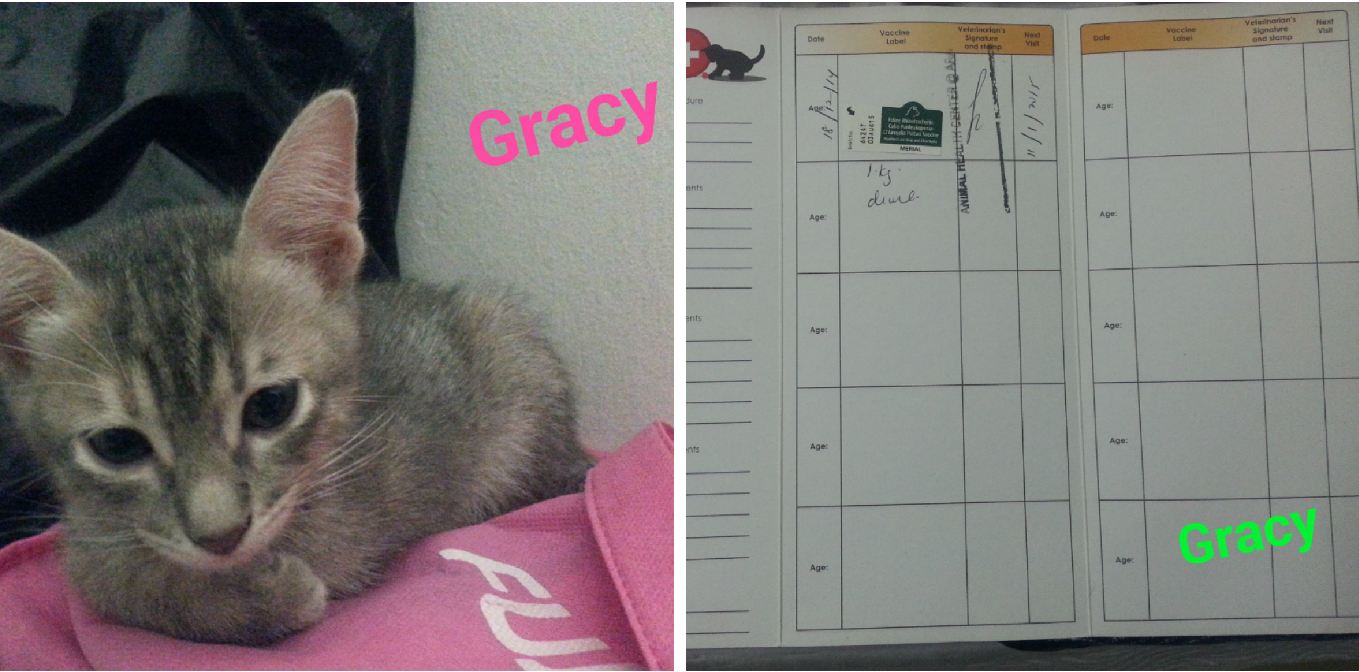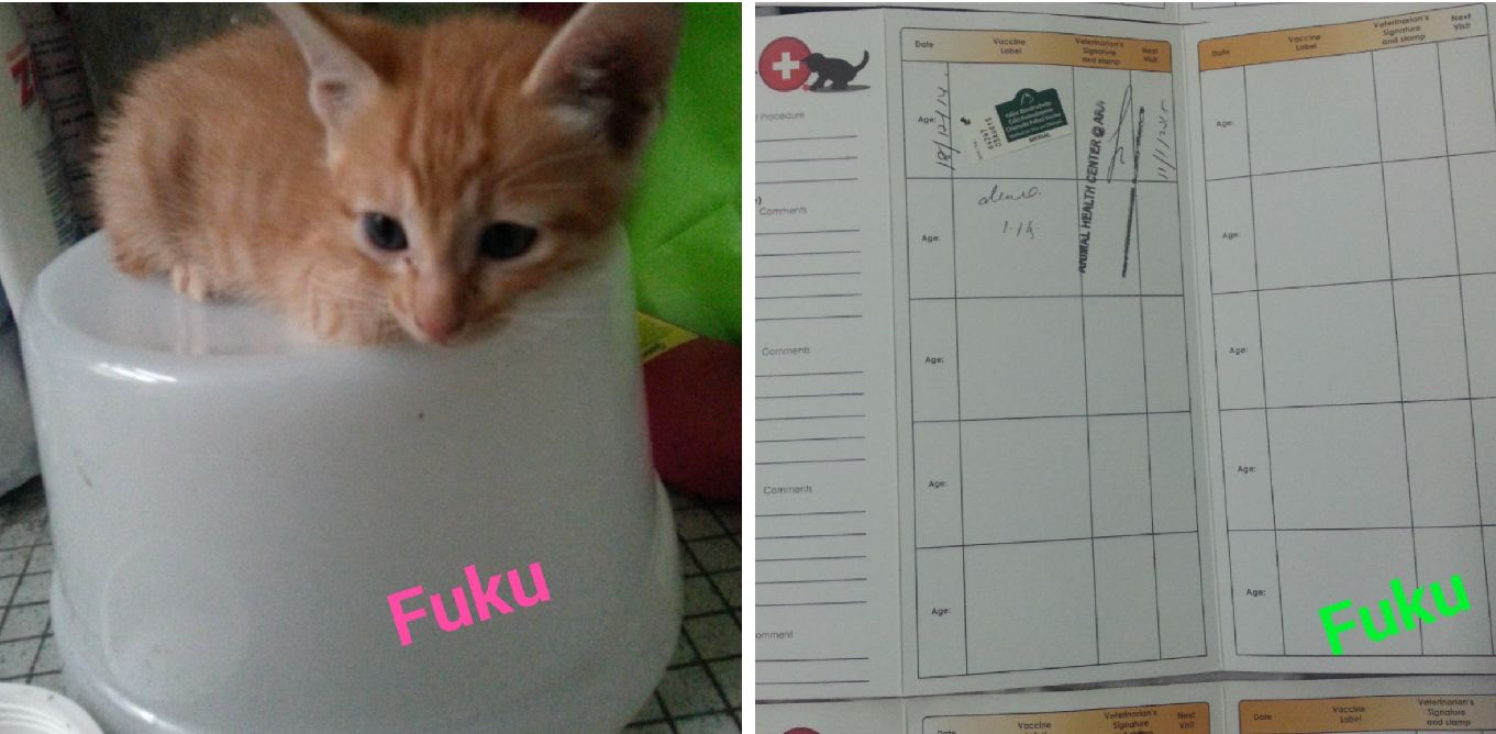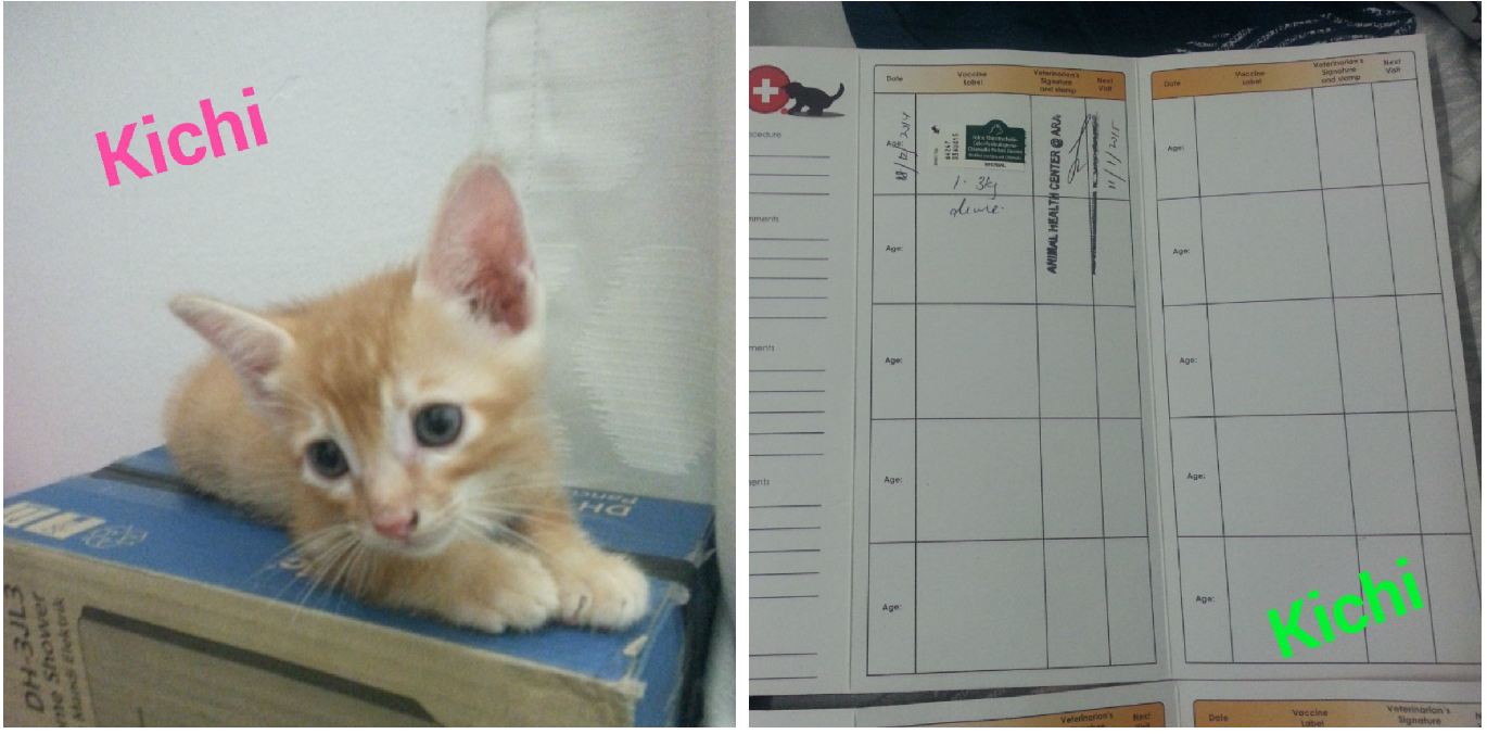 I have had 3 kittens (initially 5 kittens and 2 were adopted) of stray cat Mimi vaccinated 1st jab. Attached are photos of the kittens and vaccination record. On the box is Kichi, on the chair is Fuku and gray kitty is Gracy. Kichi and Fuku are male and Gracy female. They will be rehomed once potential adopter found. (Screening of potential adopter in progress)I will post original receipt and application form tomorrow. Thank you.