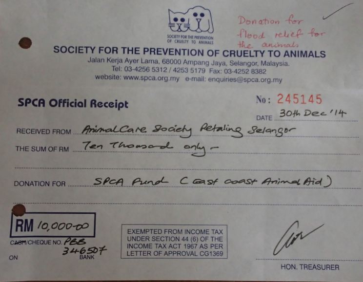 This was during the period of the floods in the East Coast and we felt there was a great need to assist in the efforts to help the animals there, so a portion of these funds along with our own reserves were donated to SPCA to aid in their flood relief efforts: http://animalcare.my/2015/01/01/animalcare-assists-in-flood-relief-efforts-for-the-animals/