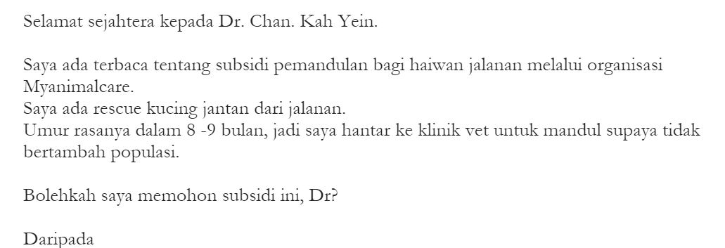 Neutering aid for 1 cat in Kuantan (Norafiza bt Mohd Nordin’s)