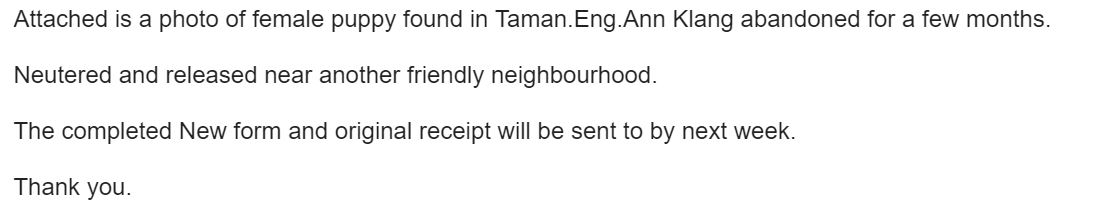 Neutering aid for 1 dog in Klang (Sim Kwee Lan’s)