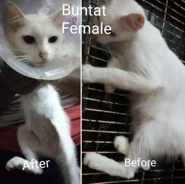 Buntat dijumpai pada January , 2018 . Kucing yang dijumpai dalam keadaan lapar dan masih kecil ditepi semak samun. Atas dasar kasihan dan takut akan haiwan berbisa yang mungkin akan memakan nya, saya mengambil keputusan untuk membawa dia pulang. Buntat telah selamat menjalani pembedahan kecil bagi pengkasian. Saya akan terus menjaga Buntat sehingga akhir hayatnya.