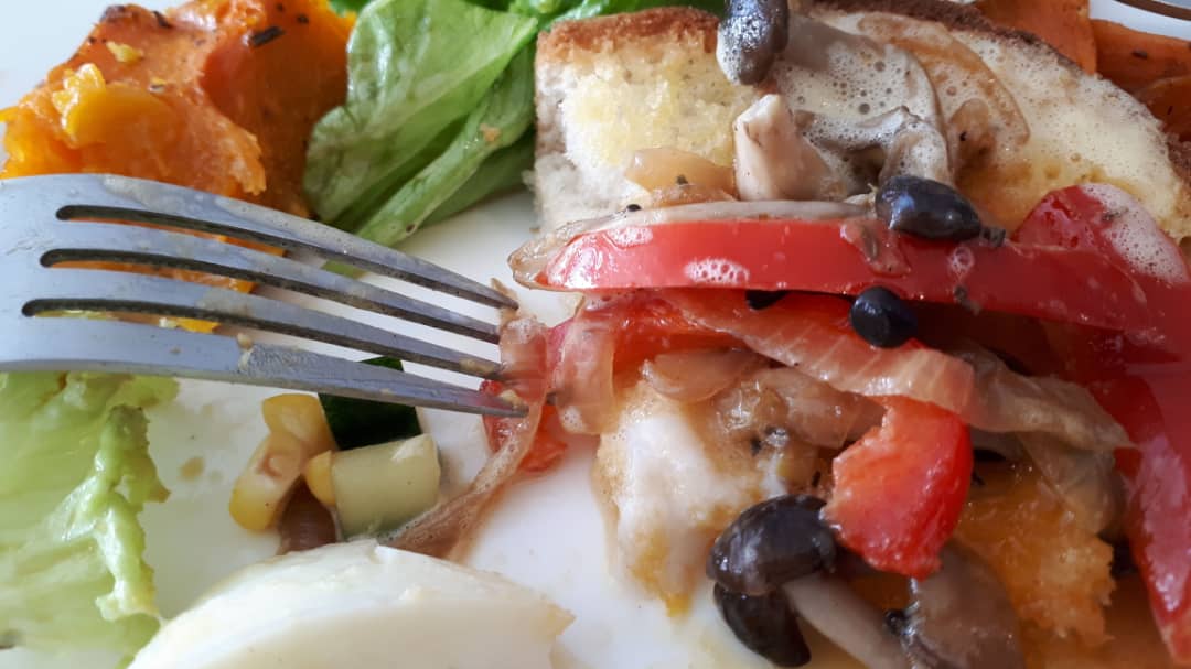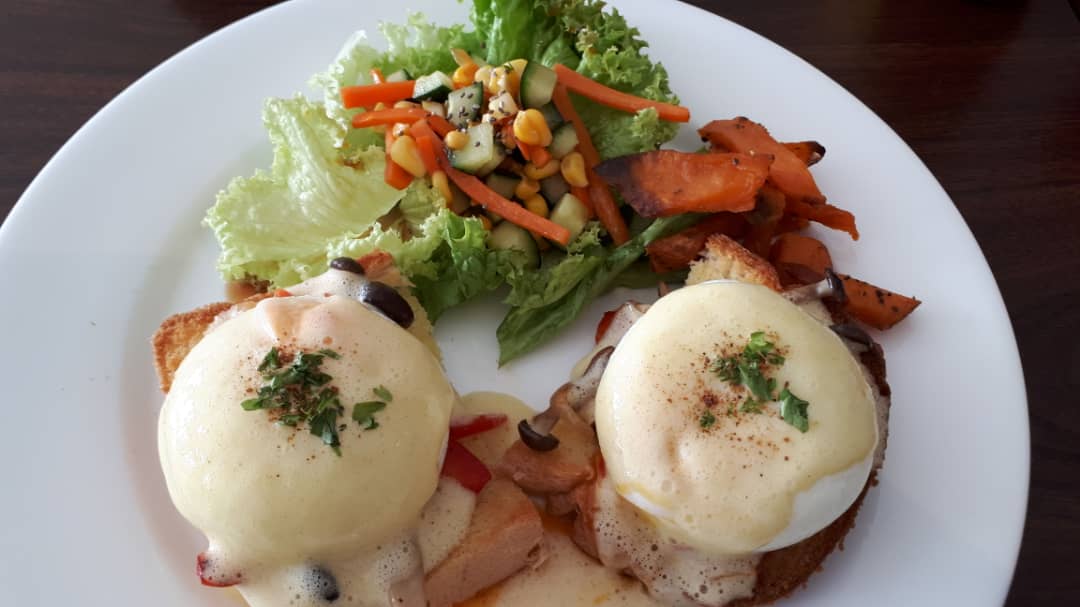 This is the poached eggs I ordered for brunch today. It is supposed to be served with chicken tenders but for the meatless option, they replace it with capsicum and other vegetables.