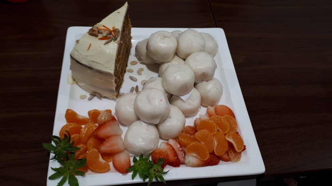 I brought the lotus paste dumplings from home, but the piece of freshly carrot cake, the mandarins and strawberries are compliments of the two chefs! How very, very kind of them!! Thank you so much.