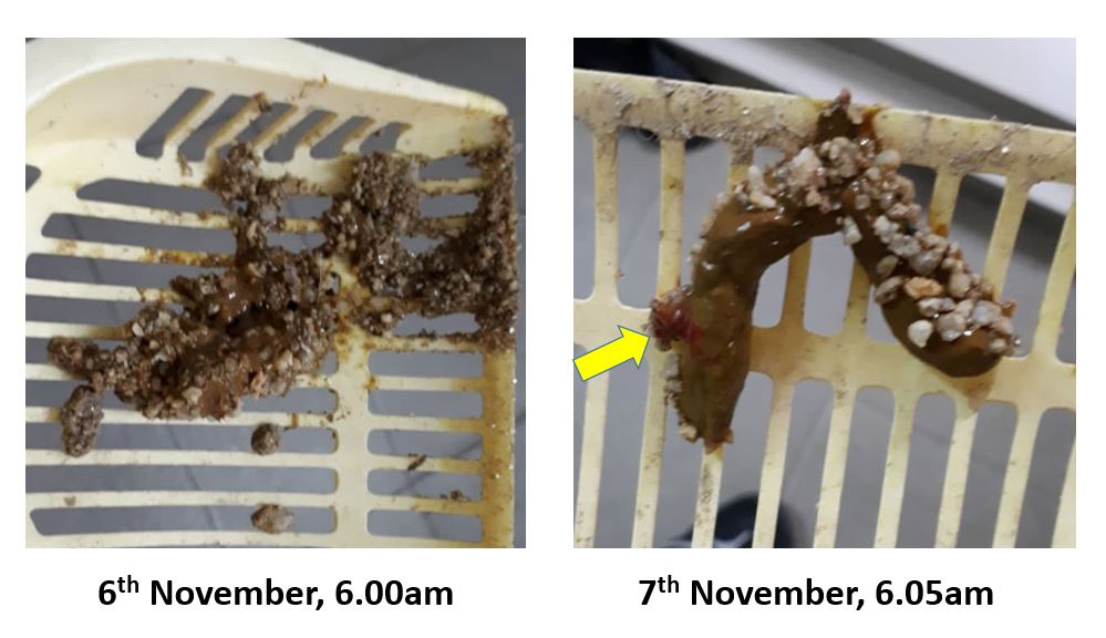 Well, it is a slight improvement from yesterday’s. It’s still soft and blood-tinged (see yellow arrow), but at least it’s not pasty or runny. And, it has some form too. It’s also a small volume (he ate quite a lot yesterday), so this means most of the food is absorbed.
