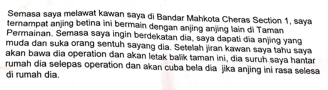 We have provided a full sponsorship of RM150 for the neutering of this dog.