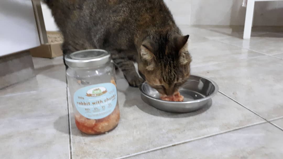 The whole purpose of getting Rabbit in the first place was because of Indy. It was his chronic loose stool problem – I read that someone tried “everything” for his cat, Julien, and nothing worked until he switched his cat to rabbit for three months and that solved the problem. After that, his cat could eat chicken again, but because of this experience, he now ensures all his cats get a different protein at EVERY single meal.
