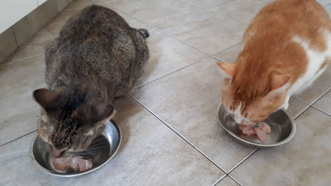 Recently, I also trained the cats to transition from fillet chunks to thigh chunks. The “hardworking” dark-coloured muscle meat has more taurine and less phosphorus.
