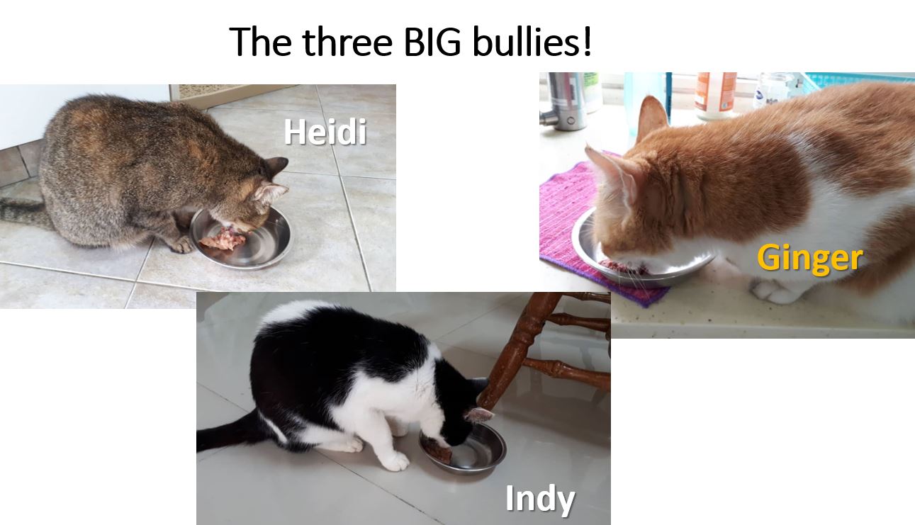 Heidi was a canned food junkie. She wanted nothing but her canned tuna. It took one month to convert Heidi to 100% raw and the process started with a total hunger strike (boycott) from her when the rest of the cats had raw food. She would walk out of the kitchen in a huff, preferring to starve than smell the raw food. But even she only took one month to convert. But it took a lot of perseverance and also a calm mental attitude on my part – “Oh, you don’t want? That’s okay. No worries, no biggie….” No stress. Just a quiet determination and not giving up.