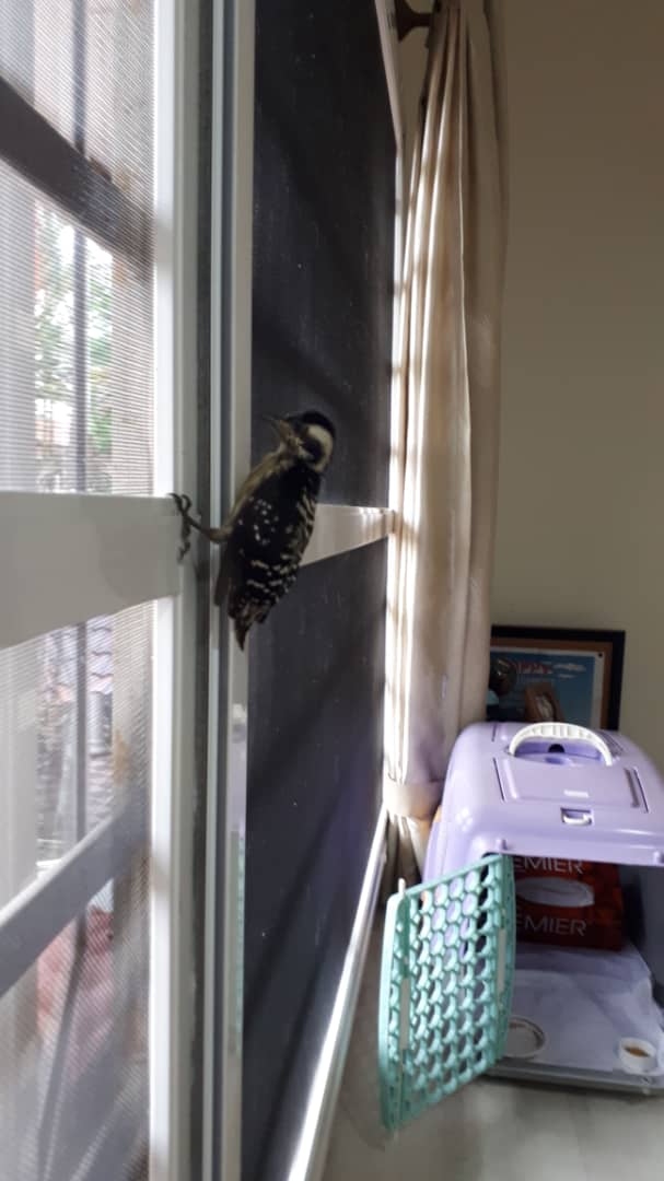 I finally just let her perch on the branches and peck on them. I read that woodpeckers suck the sap from tree branches that they peck on.