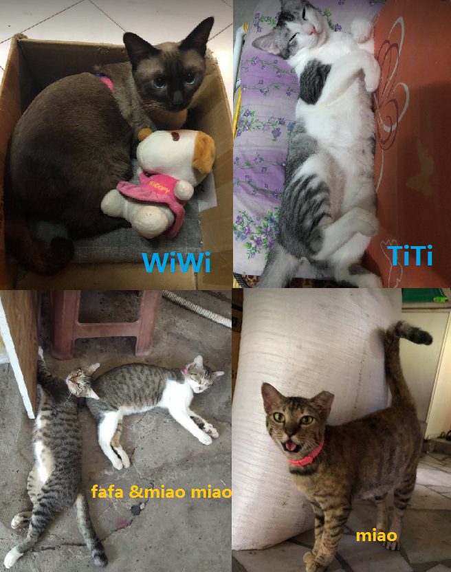 Milk Tea and Niu Niu are both female strays near my house which I fed them at the first time when I met them.