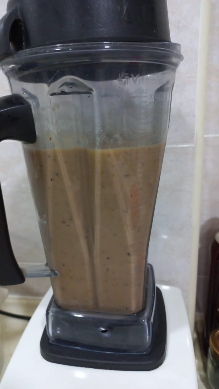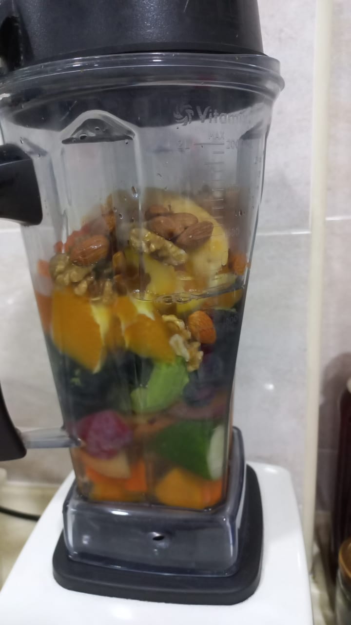 Let’s see…what did I dump into the Vitamix today? Carrot, pumpkin, cucumber, avocado (with the seed – the most nutritious part, never ever throw away the seed, please), grapes, blueberries, peach, orange, papaya, banana, walnuts, almonds and water.