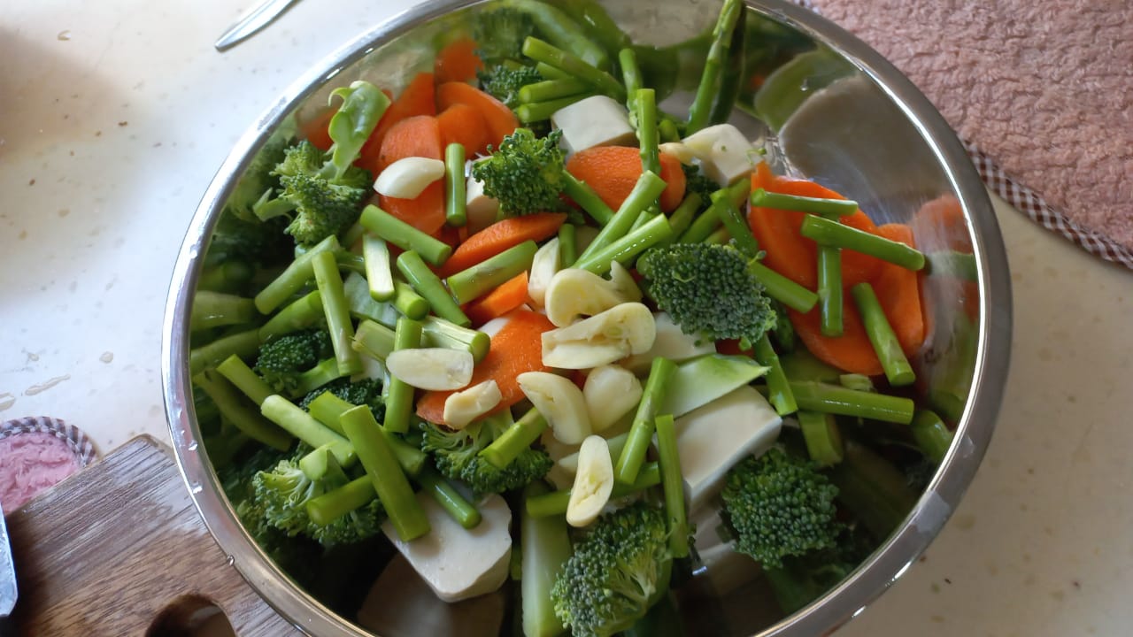 Again, it’s anything goes. This dish today has tofu, asparagus, broccoli, carrot and garlic. You can use any vegetable you have. For pescetarians, you can add fish or prawns. Or chicken, if you eat that.