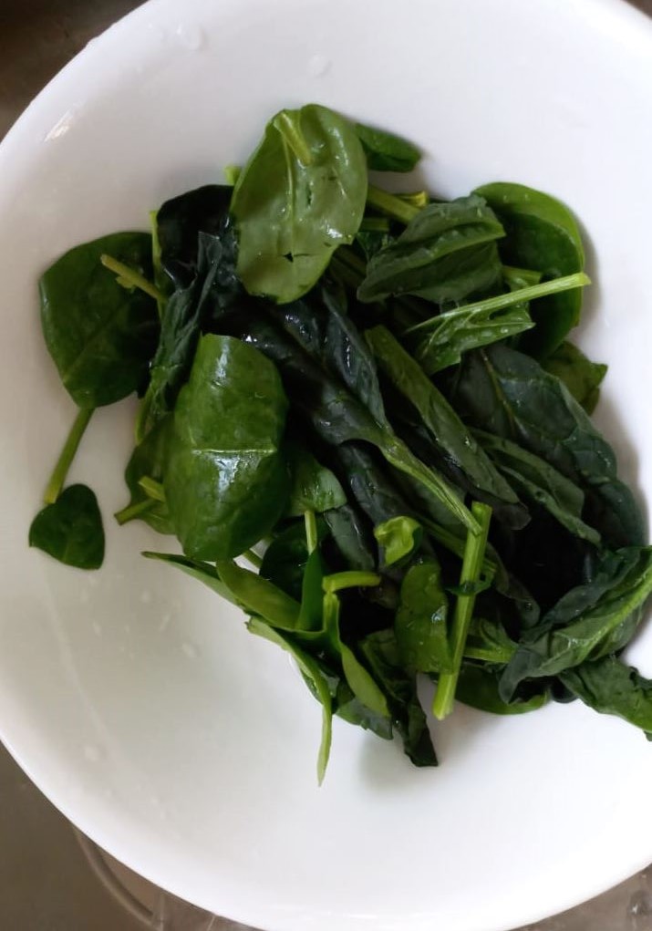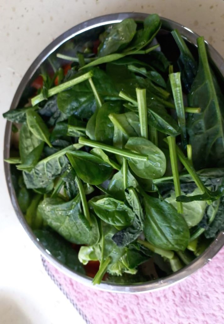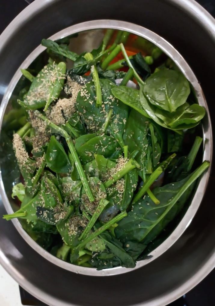 Midway steaming, say about 5 minutes into it, you can add greens. Today I’m adding spinach and baby spinach.