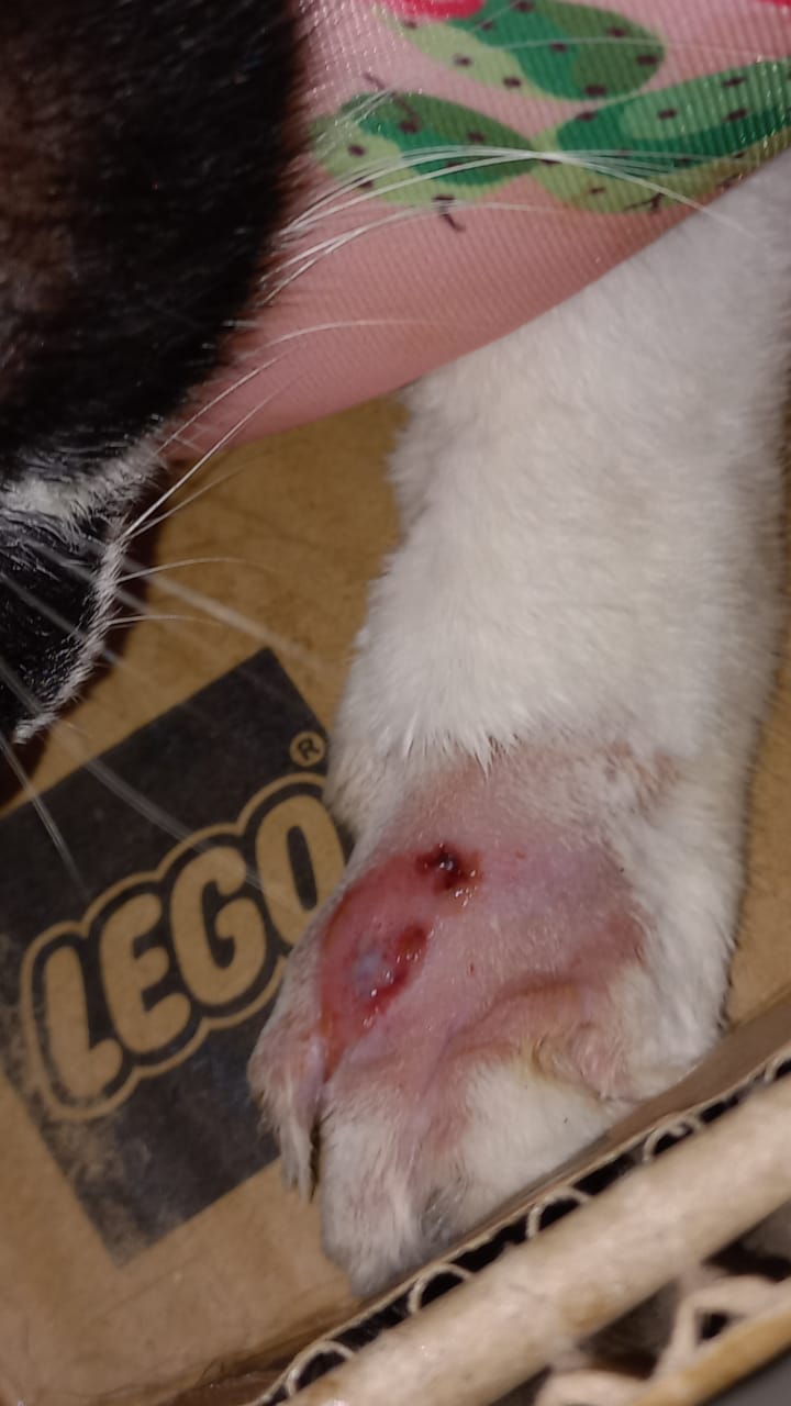 Anyway, the swelling seems to have gone down. But the trouble with these wounds is that if there are still pathogens festering inside, pus can still form and if there is no outlet for it, it can tunnel again. So, it’s really still a waiting game and it’s all about monitoring it daily until it is completely healed. I still update the vet every day with photos. Indy can already put pressure on his paw entirely, but he could already do this on Day 3, with the occasional limp. Now, there is no more limping at all.