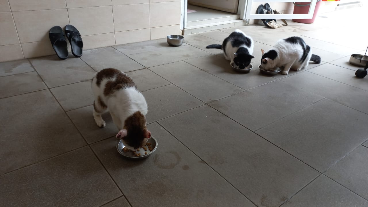 Back home for a quick snack. Cow Mau and Indy wanted the snack too.