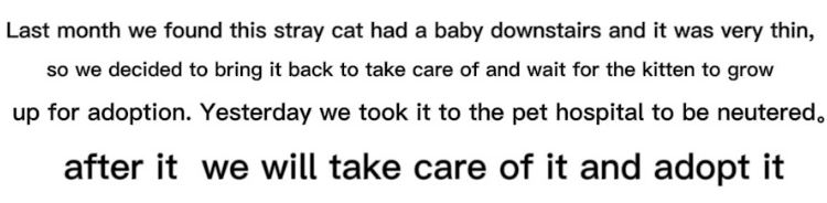 We have provided an aid of RM100 for the neutering of this cat.