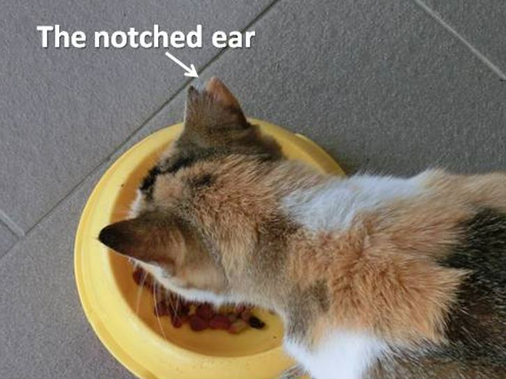 What works would be to get these animals neutered and returned to the colony to be managed by compassionate caregivers who will continue to feed and care for them. We coin this method CNRM which stands for Care-Neuter-Return-Manage, also universally known as TNRM (Trap-Neuter-Return-Manage). The neutered female animals are ear-notched (please refer to attached photo) to indicate that they have been spayed (neutered) and will not breed anymore. The ear-notch is done under anaesthesia during the spaying procedure itself. The neutered male animals need not be ear-notched as the absence of the testicles is easily visible to anyone. Neutering stops the breeding and thus, the population is controlled.