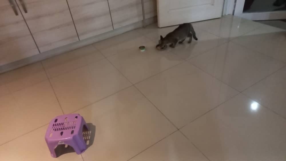 This is her second breakfast this morning – canned tuna and seabream. Previously, Samantha did not know how to eat canned food at all.