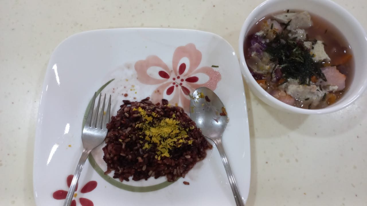 I cooked it as recommended by a Singaporean medical doctor who uses food as medicine for his patients, with a lot of water, then I pour away the water. So the rice is a bit wet. The reason for putting a lot of water and pouring it away is to get rid of the arsenic in the rice. Also, black rice must be soaked overnight. All rice contains arsenic, but more in brown and black rice.