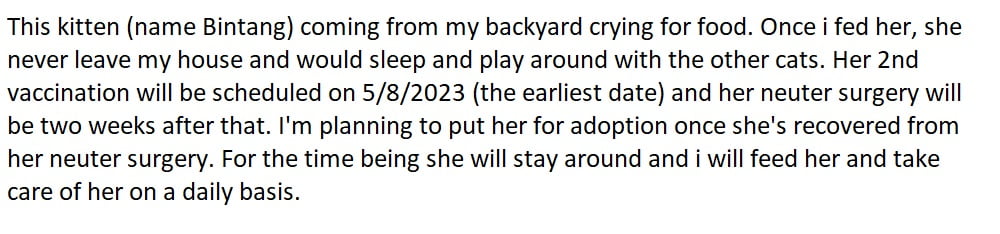 We have provided an aid of RM25 for the vaccination of this cat, Bintang.