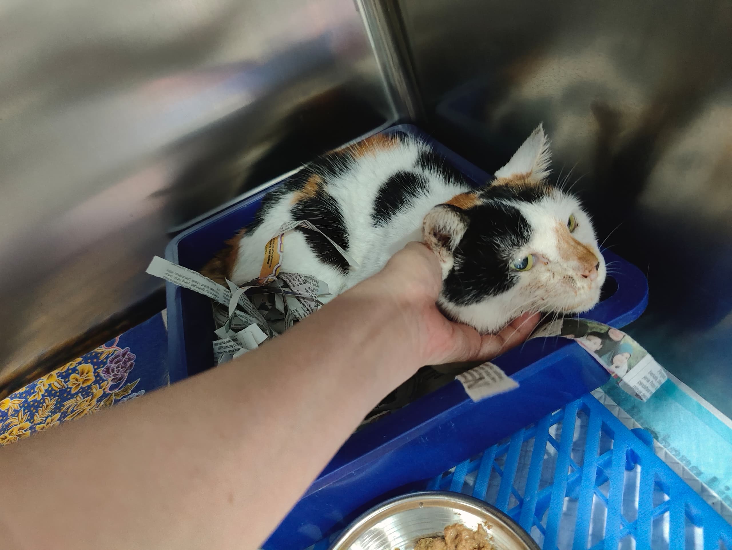 The vet sent this photo at 9.45am this morning, shortly after the clinic opened. She said Cleo ate a bit of the leftover food through the night. It wasn’t enough, though, so they syringe-fed her. Cleo also appears calmer and more settled now. She urinated a fair amount but there was no defecation.