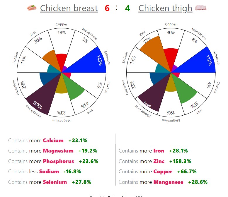This link gives you a lot of information, comparing chicken breast and chicken thigh: https://foodstruct.com/compare/chicken-breast-vs-chicken-thigh