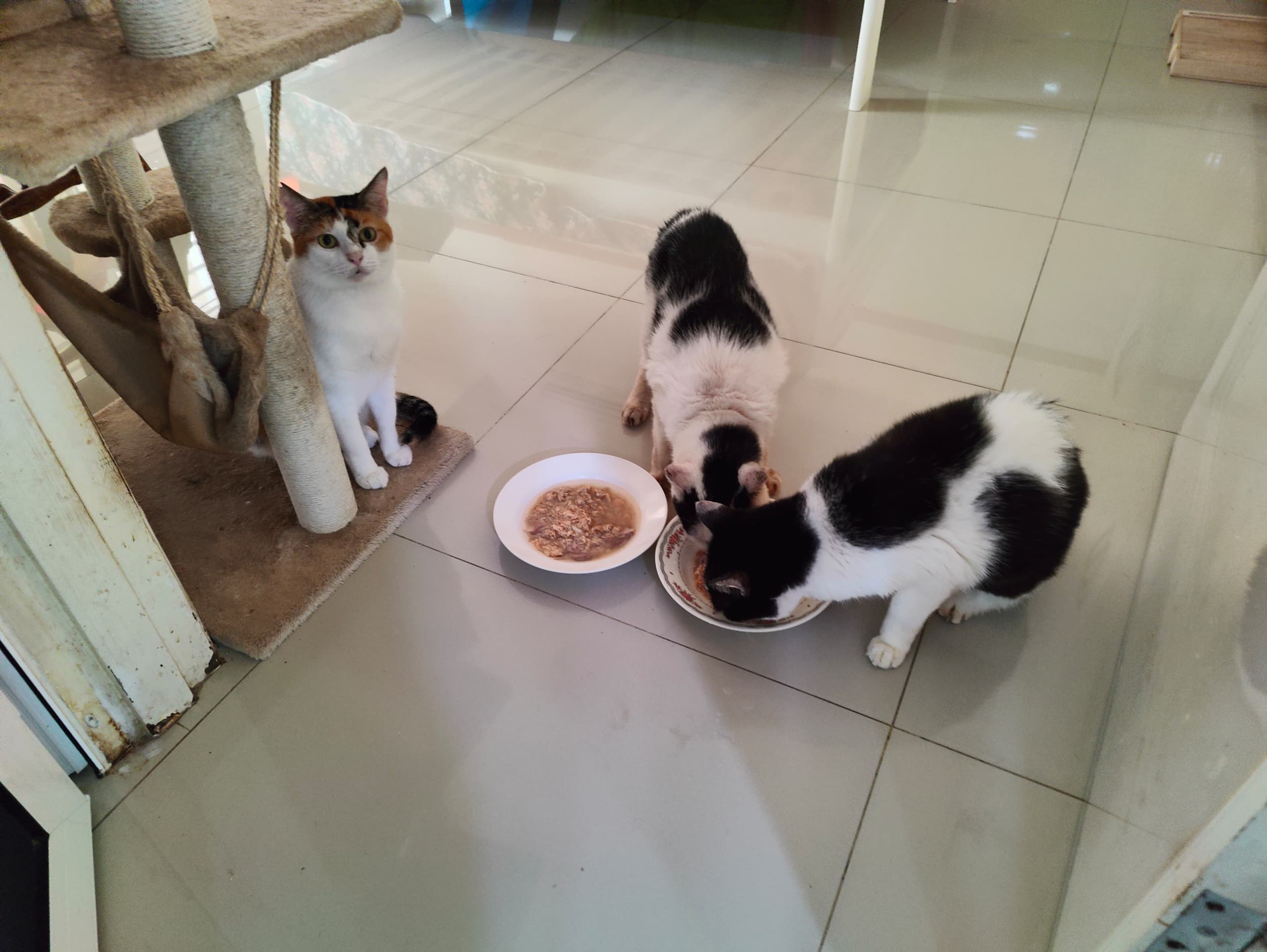 Here’s Cow Mau and Indy sharing a plate of soupy homemade food. That is Samantha looking on.