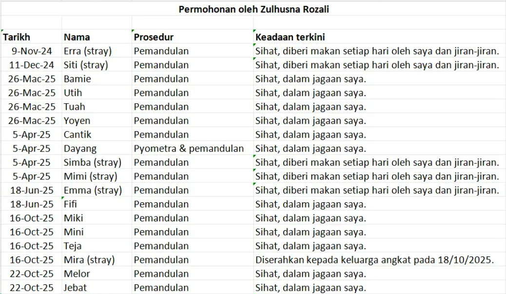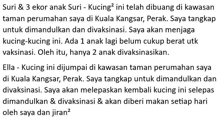 We have provide an aid of RM120 for the vaccinations of these 4 cats.