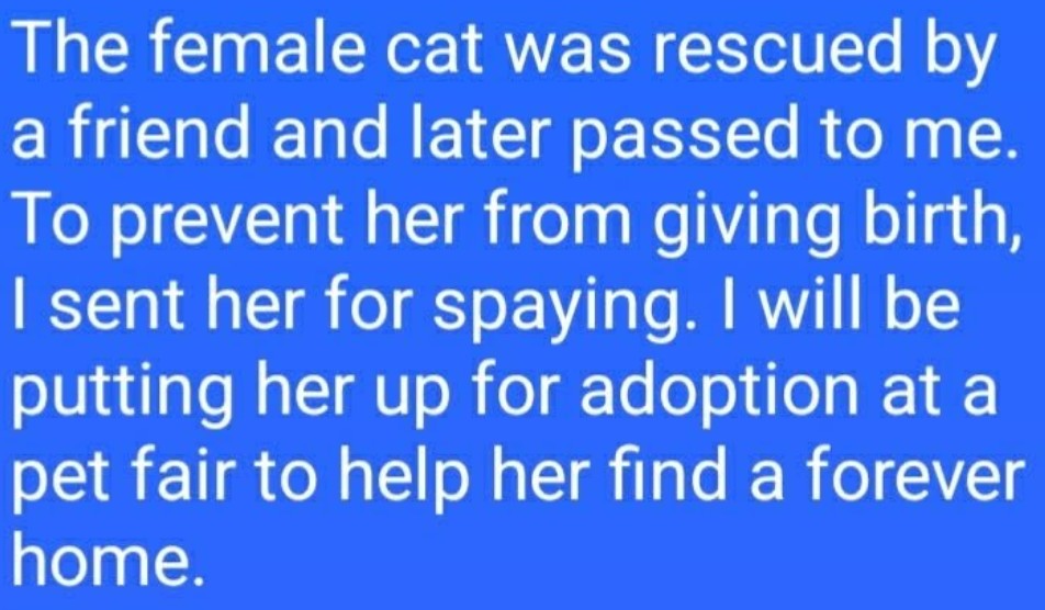 We have provided an aid of RM150 for the neutering of this female cat. This cat also had ovarian cysts.