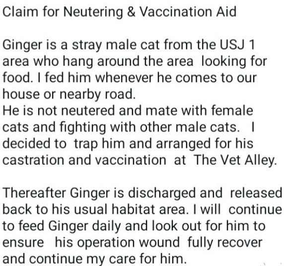 We have provided a full sponsorship of RM80 for the neutering of this male cat.